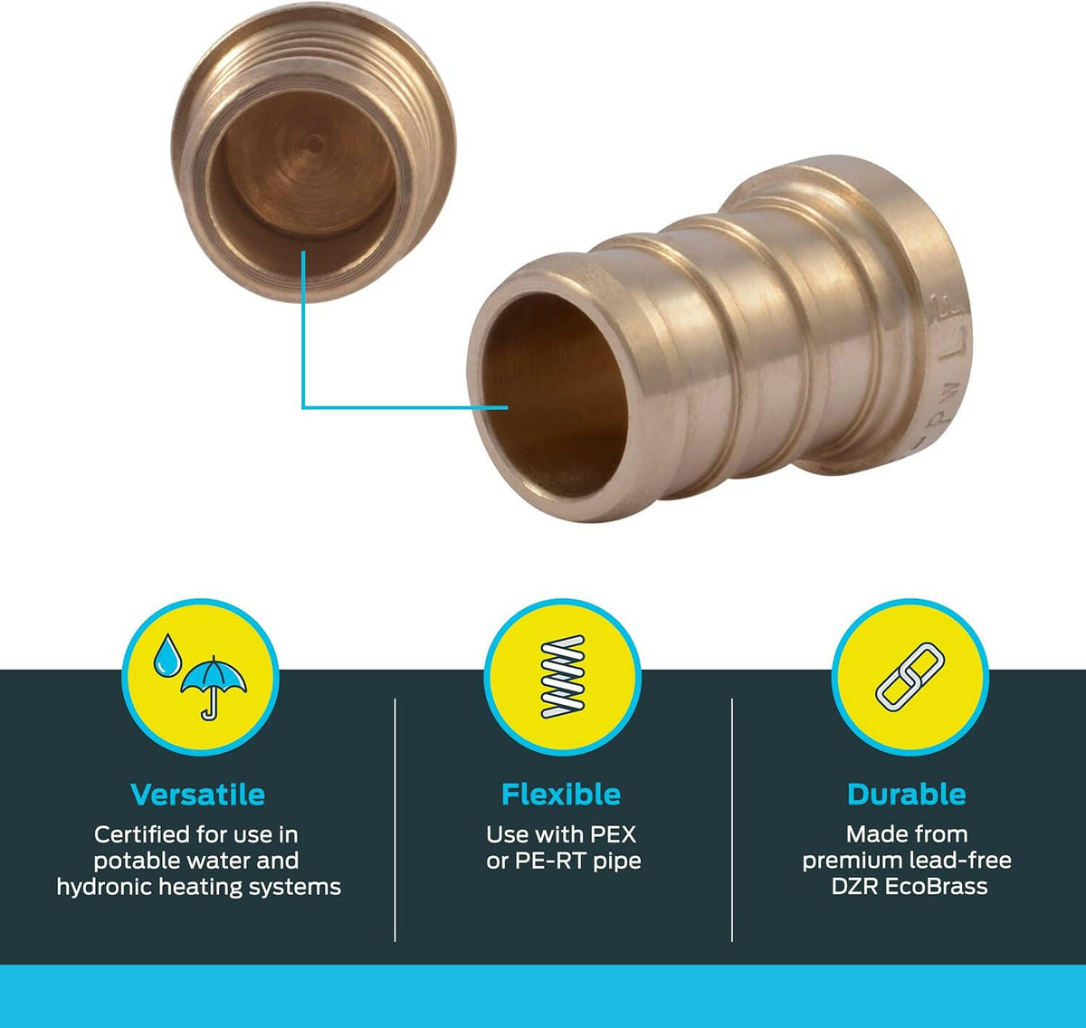 Conecte el extremo de la tubería PEX con una conexión engarzada o de abrazadera. Certificado para uso en agua potable y sistemas de calefacción hidrónica.