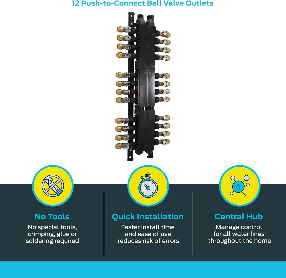Similar a una caja de interruptores eléctricos, permite el control central de todas las líneas de agua de toda la casa. El innovador diseño de conexión por presión permite una instalación rápida y sencilla. Minimiza el riesgo de fugas eliminando el exceso de puntos de conexión. Diseñado para uso en un sistema PEX.