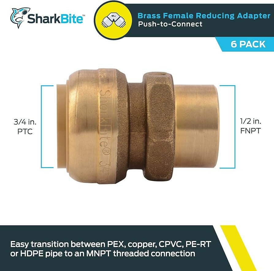 SharkBite Adaptador hembra de empuje de latón FNPT de 3/4 pulg. x 1/2 pulg.