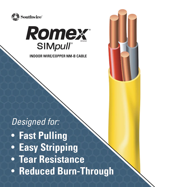 Southwire Romex® SIMpull® tipo NM-B se puede usar para trabajos expuestos y ocultos en lugares normalmente secos a temperaturas que no excedan los 90 °C.