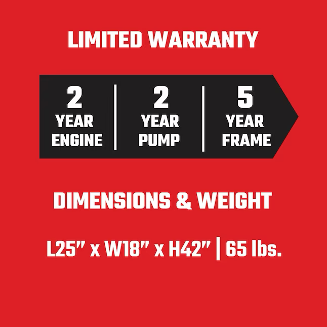 - Specifications Familia de colores/acabados Rojo Fuente de alimentación Gas Tipo de batería compatible N / A Clasificación de presión (PSI) 3400 Longitud del cable (pies) 0 Tipo de bomba Leva axial Con cable/inalámbrico Sin cable Consejos de conexión rápida Sí Profundidad (pulgadas) 25 Aceite de motor recomendado 10W-30 Opciones de tanque de detergente Tanque único Tipo de inicio Arranque manual/por cuerda Marca del motor N / A Uso Trabajos de tipo medio Cilindrada del motor (centímetros cúbicos) 208 psi variables No Caballos de fuerza del motor 0 Depósito de agua No Aceite de motor incluido Sí Temperatura de agua Frío Serie de motores 0 Diámetro de la rueda (pulgadas) 12