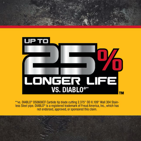 En comparación con DIABLO® DS0608CF, corte con cuchilla con punta de carburo de 2,375 pulg. de diámetro exterior x 0,109 pulg. de pared, tubo de acero inoxidable 304, DIABLO® es una marca registrada de Freud America, Inc., que no ha respaldado, aprobado ni patrocinado esta comparación.