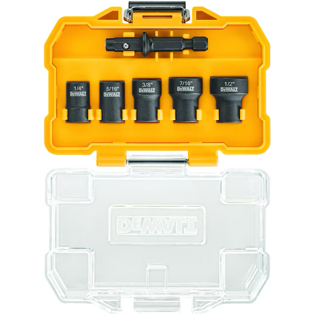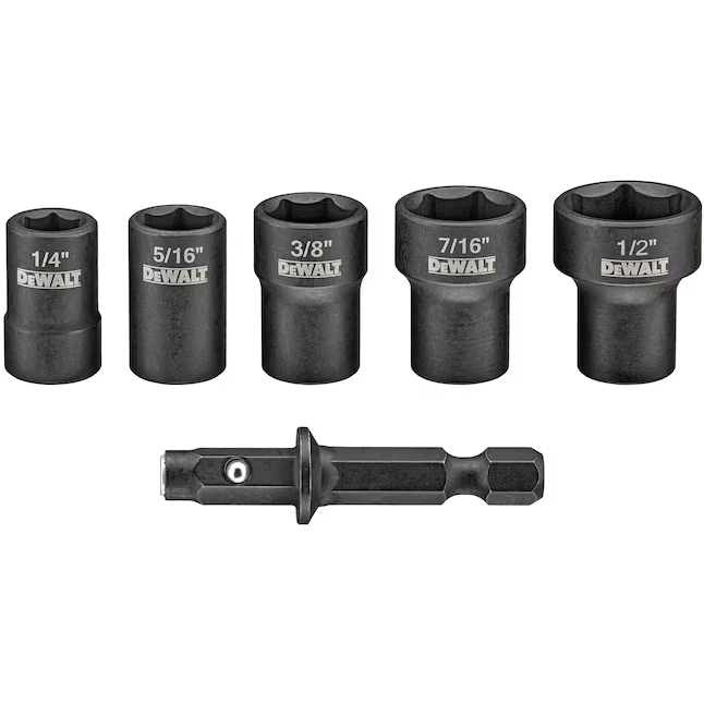 Con cada pieza fabricada con acero para herramientas resistente a los golpes, el juego de puntas de destornillador de impacto para atornillar tuercas DEWALT IMPACT READY de 5 piezas es una valiosa adición a su caja de herramientas. Además de su marca, las llaves de tuercas de este juego de 5 piezas son desmontables y lavables. Al separarlo del vástago, puede limpiar los residuos que se han acumulado en el driver, mejorando su vida útil. Los destornilladores también están equipados con tecnología de bloqueo de tornillo magnético, por lo que pueden sujetar el tornillo y el perno para aplicaciones de fijación más sencillas con una sola mano o por encima de la cabeza. Con un vástago universal que se adapta a llaves de tuercas desmontables de entre 1/4 y 1/2 pulgada, este juego es lo suficientemente versátil para diferentes aplicaciones. El diseño de llave de tuercas desmontable permite a los usuarios limpiar los residuos, mejorando la vida útil en general.