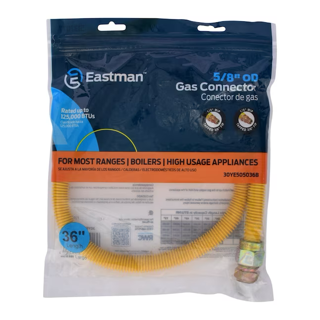 El conector de gas Eastman™ de 5/8 IN DE DE OD está diseñado para conectar la mayoría de las principales marcas de estufas de gas, calderas y electrodomésticos de alto uso a una válvula de cierre. El conector está certificado para su uso con la mayoría de estufas y calderas con clasificaciones de gas de hasta 125 000 BTU. El revestimiento epoxi DuraCoat™ brinda protección adicional contra la corrosión, las manchas químicas de productos domésticos comunes y los rayos UV y está aprobado para uso en interiores y exteriores. Incluye (1) conector de cocina de gas con revestimiento epoxi de 36 PULG. 5/8 PULG. OD, (1) conector MIP de 1/2 PULG (FIP roscado de 3/8 PULG.), (1) MIP de 1/2 PULG ( Accesorio roscado FIP de 3/8 IN.