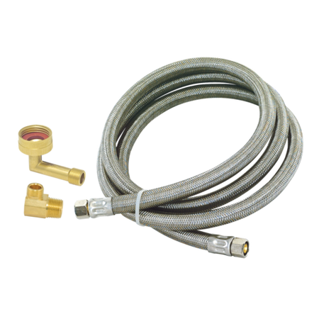 - El kit incluye: (1) línea de suministro trenzada de acero inoxidable de 8 pies y 3/8 pulg. Comp. conexión, (1) codo de tubo de hierro macho de 3/8 pulg. y (1) codo de rosca de manguera hembra de 3/4 pulg.