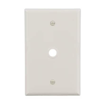 • Placa de pared de tamaño mediano, de una sola salida, con orificio de 0,40 In para aplicaciones telefónicas y coaxiales.
