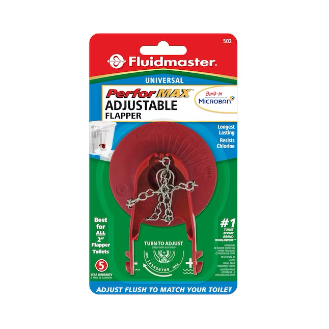 Ahorre agua y dinero, mientras resuelve problemas comunes de descarga y funcionamiento del inodoro con la aleta de ahorro de agua Fluidmaster 502 PerforMAX de 2 pulgadas. Con el innovador dial ajustable de ahorro de agua PerforMAX que optimiza el rendimiento y el uso de agua con cada descarga. Esta trampilla para inodoro de alta calidad está fabricada con materiales resistentes a la corrosión para una larga vida útil y un marco sólido para un sellado seguro en todo momento. El diseño universal se adapta a la mayoría de los inodoros con válvula de descarga de 2 pulgadas, desde diseños de 1,28 HET a 3,5 GFP. Ahorre tiempo de reparación de bricolaje. El 502 presenta un diseño altamente eficiente, que también ofrece una instalación sencilla y fácil. Flapper para inodoro ajustable 502 PerforMAX de 2 pulgadas de Fluidmaster, la mejor opción para eficiencia de descarga.