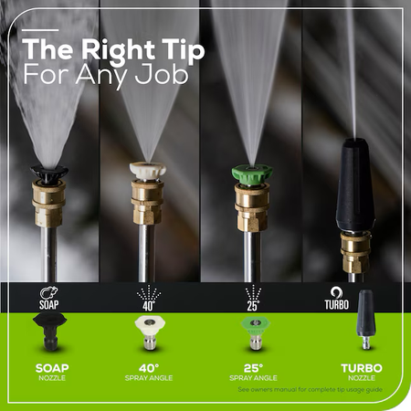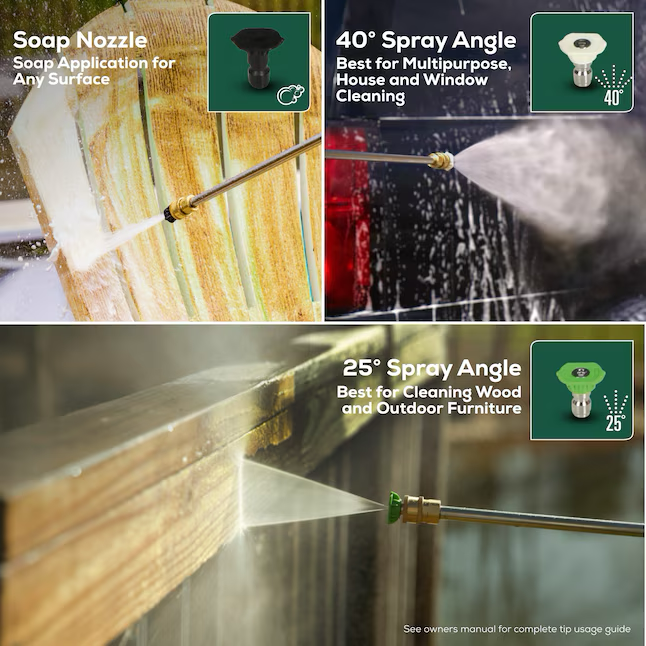 Incluye: pistola de metal resistente y manguera resistente a torceduras de 25 pies; (4) Boquillas de pulverización: Turbo, Jabón, 25° y 40°