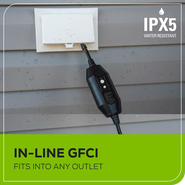 Características de seguridad: GFCI (interruptor de circuito de falla a tierra) en línea y enchufe impermeable funcionan con cualquier toma eléctrica estándar; Nivel de resistencia al agua IPX5