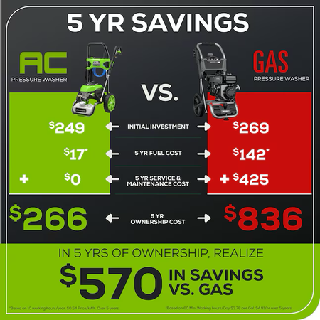 Características: Ruedas nunca planas de 10 pulgadas para facilitar su uso; Cable de alimentación extralargo de 35 pies; Tanque de jabón a bordo