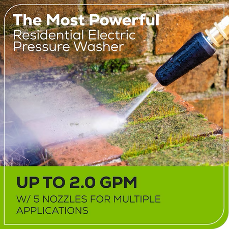 Potencia: La lavadora a presión eléctrica residencial más potente con 3000 PSI MAX, 2.0 GPM MAX (GPM varía de 1.1 GPM a 2.0 GPM con boquillas incluidas)