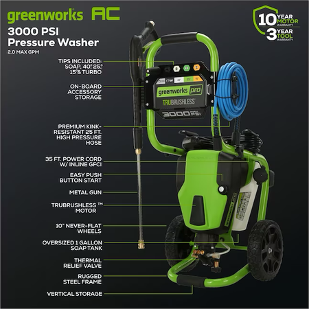 Lavadora a presión eléctrica de agua fría Greenworks Pro 3000 PSI 2 galones