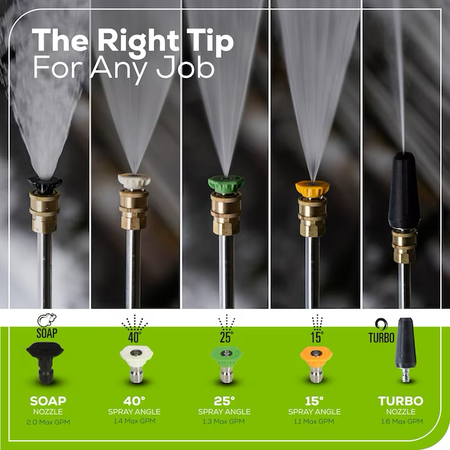 Incluye: pistola de metal resistente y manguera resistente a torceduras de 25 pies; (5) Boquillas de pulverización: Turbo, Jabón, 15°, 25° y 40°