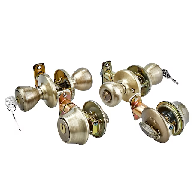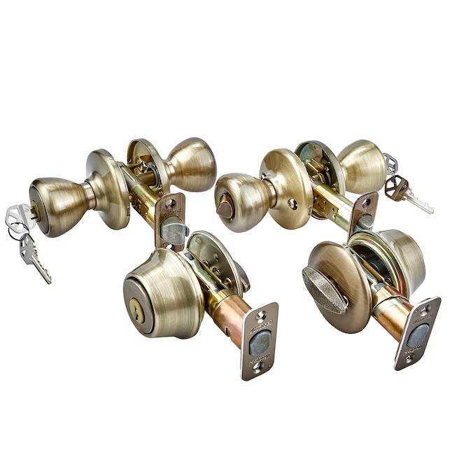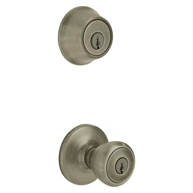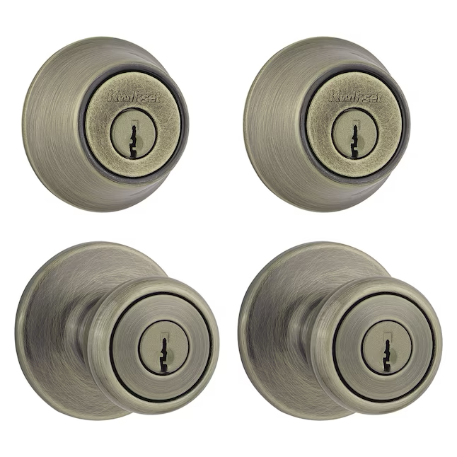 Kwikset Security Tylo Exterior de latón antiguo Cerrojo de un solo cilindro Perilla de puerta de entrada con llave Paquete múltiple con tecnología antimicrobiana