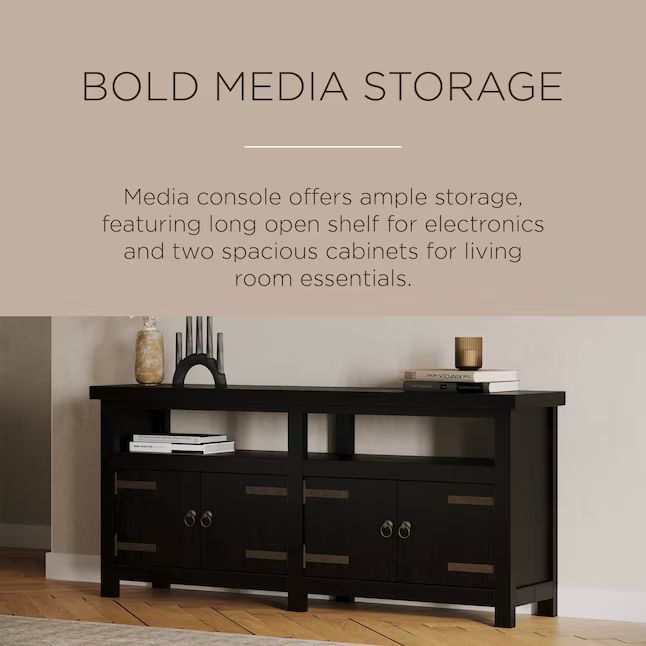 Consola multimedia con abundante espacio para albergar las necesidades de entretenimiento con un estante abierto, ideal para dispositivos electrónicos para un fácil acceso remoto y 2 cajones grandes para guardar artículos.