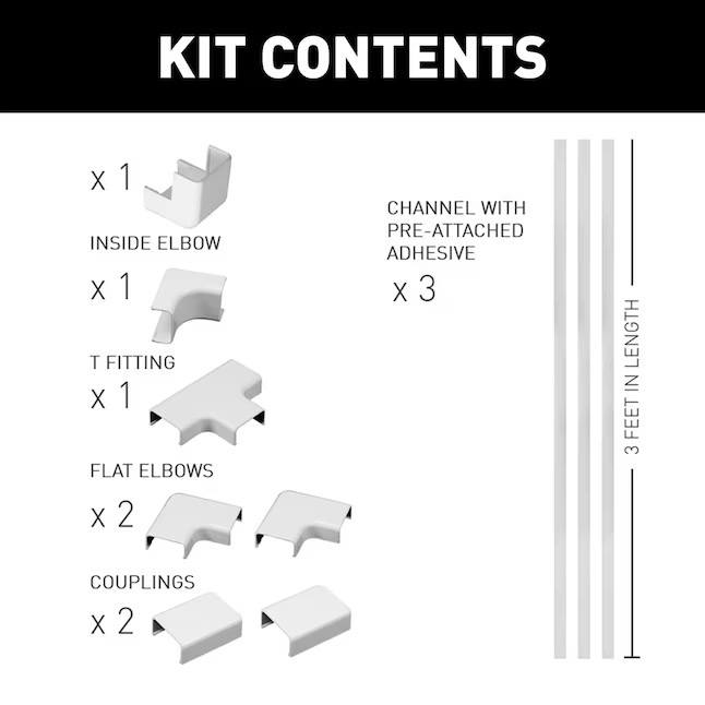 El kit viene con tres secciones de piezas de canal de 4 pies con respaldo adhesivo preinstalado para una instalación rápida con despegar y presionar.