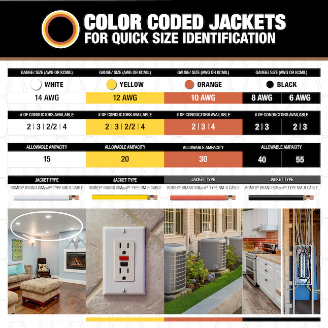 El alambre de cobre para construcción Romex tipo NM-B se aplica comúnmente en el cableado de edificios residenciales como circuito derivado para interruptores y tomacorrientes.