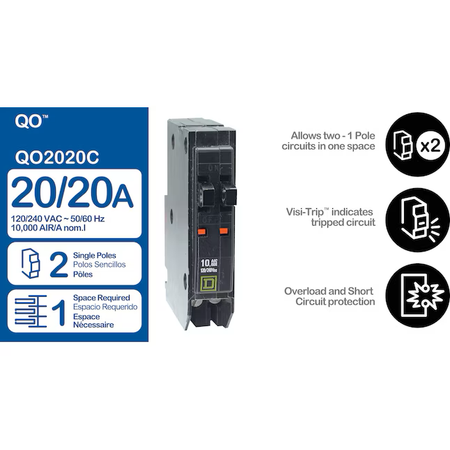 • El disyuntor de reemplazo unipolar en tándem Square D QO de 20 amperios ofrece 2 polos en el espacio de 1, para uso en centros de carga CTL QO de estilo antiguo y sin clase y centros de carga neutros enchufables.