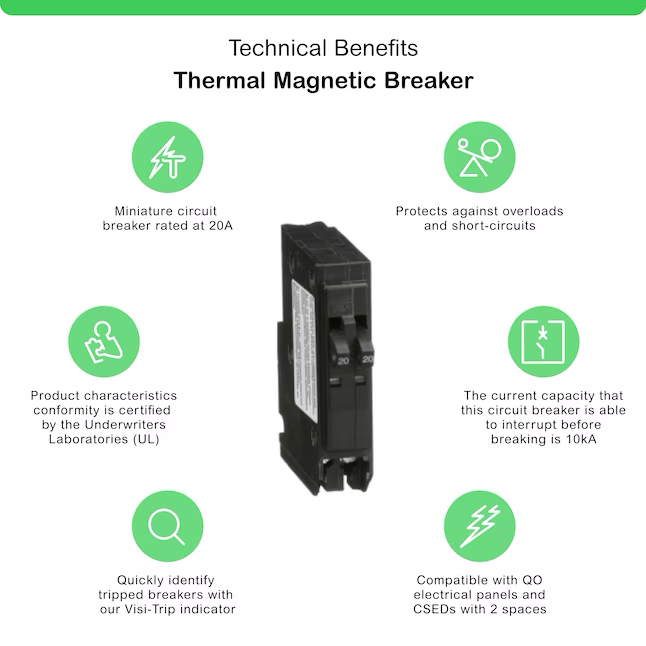 • El disyuntor de reemplazo unipolar en tándem QO de 20 amperios ofrece 2 polos en el espacio de 1, ya que el disyuntor de reemplazo es para uso en centros de carga CTL QO de estilo antiguo y sin clase y tiene una carga máxima de 240 voltios.