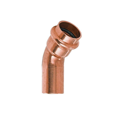 El codo de calle Eastman de 2 pulgadas x 2 pulgadas de cobre FTG x presión de presión de 45 grados cuenta con una junta tórica de EPDM de alta calidad para crear un sello hermético y sin fugas. Fácil de usar, simplemente aplique presión con una herramienta de presión para apretar la junta tórica en el tubo, asegurando un sello limpio y hermético en segundos sin llama, soldadura ni fundente. Las conexiones se pueden realizar en condiciones húmedas o secas, lo que reduce el tiempo de inactividad del proyecto. El acoplamiento es compatible con todas las principales herramientas de prensa hidráulica y está certificado por NSF y no contiene plomo.