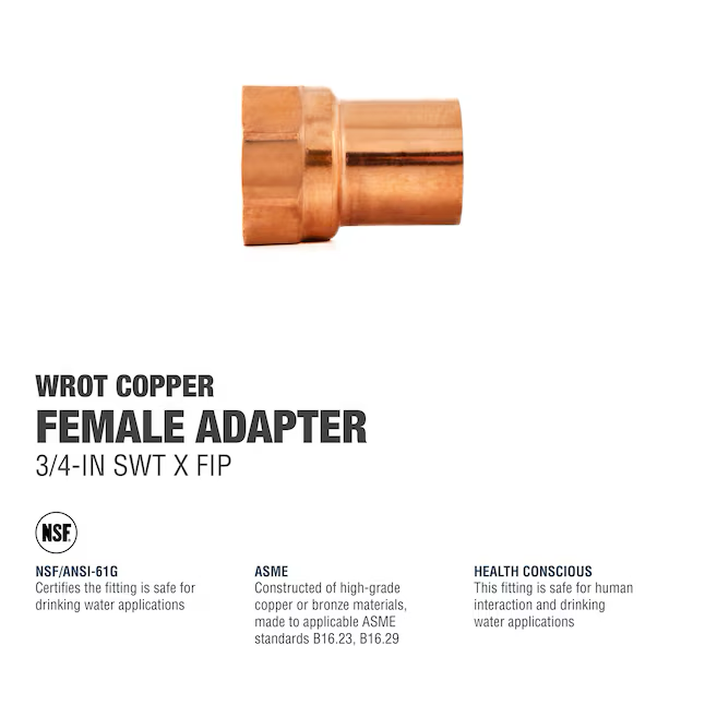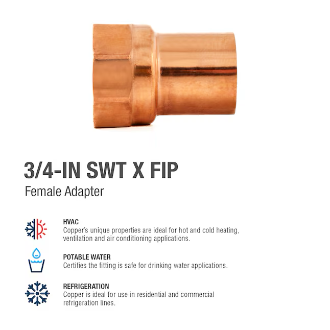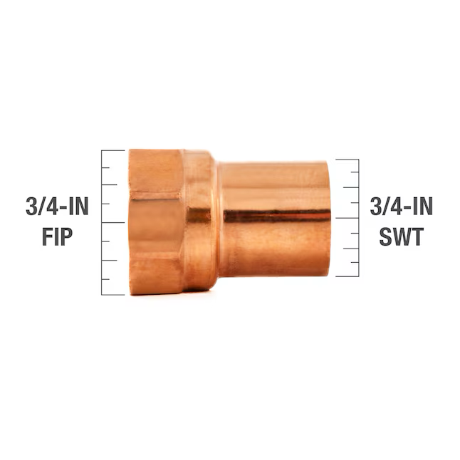 Utilice este adaptador C x FIPT de presión de 3/4 pulg. para adaptar conexiones soldadas a conexiones roscadas en entornos comerciales y residenciales. Es ideal para usar con sistemas de agua potable, aire acondicionado y refrigeración. Este adaptador de rosca hembra para uso subterráneo está diseñado para tuberías de suministro de agua sobre el suelo. Su presión máxima de trabajo alcanza los 582 PSI. Construido con cobre de alta calidad, este adaptador de presión resiste la pérdida de zinc para preservar su resistencia mecánica y es reutilizable para adaptarse a proyectos sostenibles.