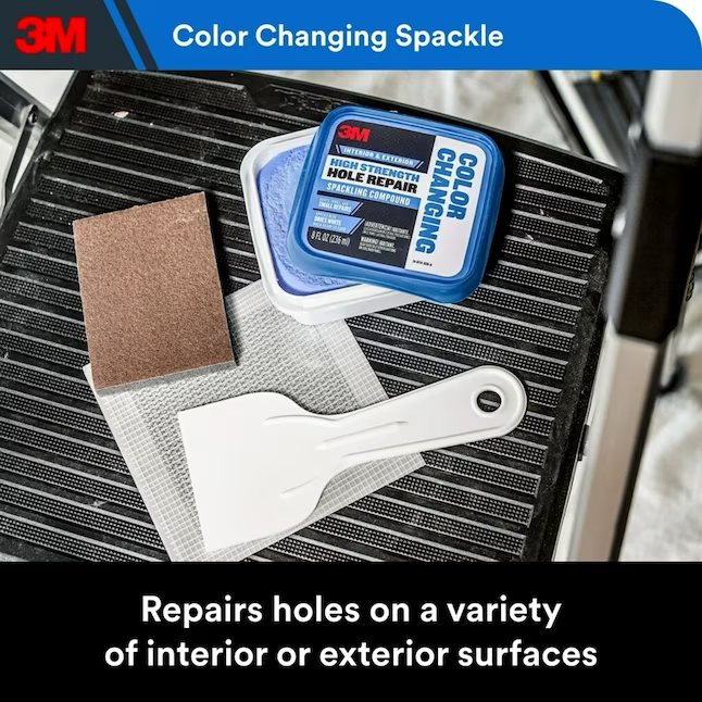 Cuando se trata de reparar paredes, usted tiene la confianza y el conocimiento para hacer bien el trabajo. Debido a que un acabado de calidad es importante, elija el NUEVO 3M™ Reparación de orificios que cambian de color de alta resistencia para ayudar a reparar abolladuras, golpes o incluso agujeros de hasta 3 ” en superficies interiores y exteriores con resultados de apariencia profesional. Esta masilla que cambia de color le permite saber cuándo está lista para lijar.