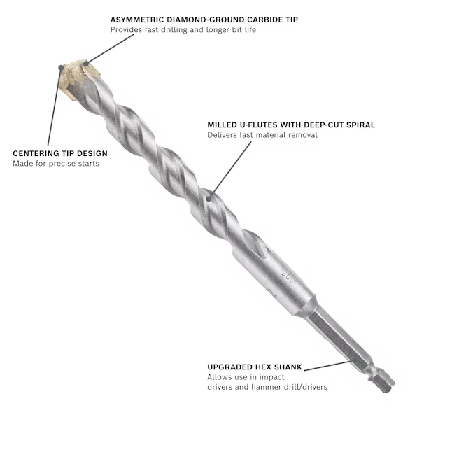 • Broca para mampostería con punta de carburo y diseño de vástago hexagonal mejorado: diseñada para proporcionar una vida útil prolongada y una rápida eliminación del material