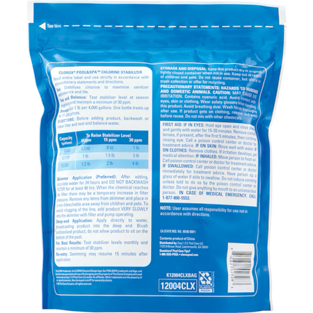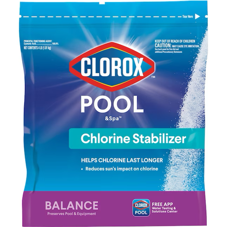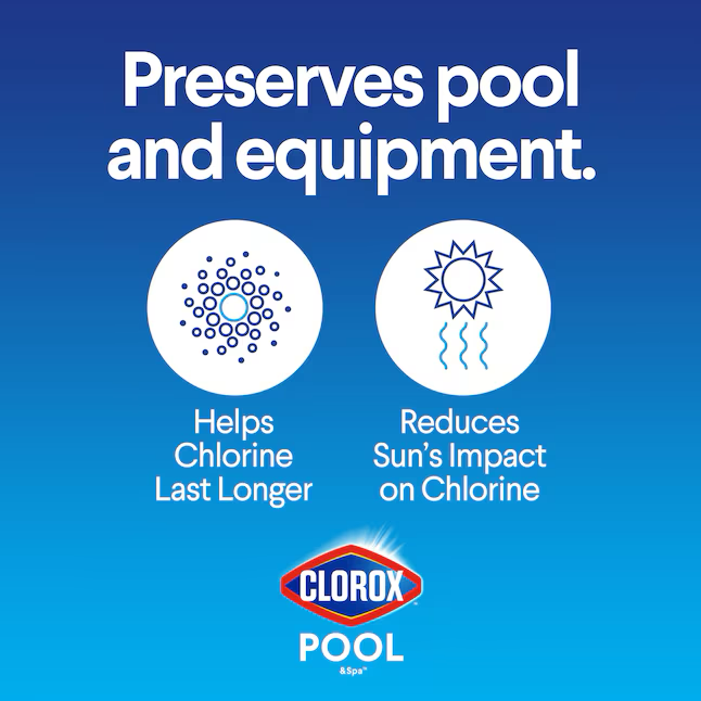 El estabilizador de cloro Clorox® Pool&Spa™ protege el cloro de su piscina de los fuertes rayos UV del sol para que el cloro dure mucho más. Proteger el cloro para que no se queme con un estabilizador de cloro significa una desinfección más duradera, por lo que no es necesario aplicar tanto producto a la piscina. El estabilizador de cloro es ideal para piscinas nuevas, piscinas de agua salada y piscinas que utilizan líquido clorante.