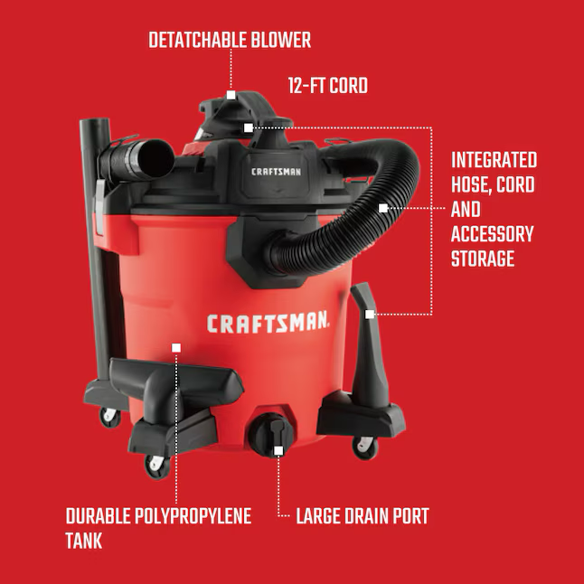 Soplador desmontable CRAFTSMAN de 12 galones y 6 HP, aspirador con cable para seco y húmedo, con accesorios incluidos