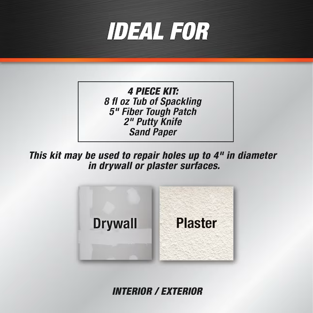 Incluye DryDex® de 8 oz; Masilla, un parche de malla de aluminio autoadhesivo flexible, un cuadrado de papel de lija de grano 100 y una espátula