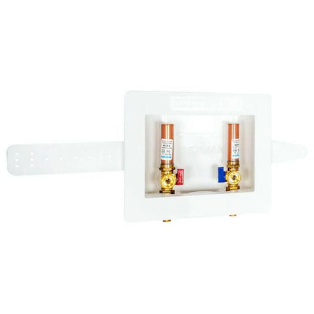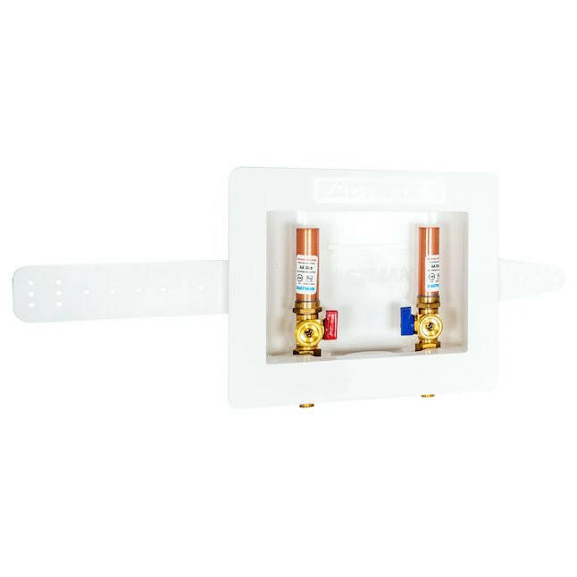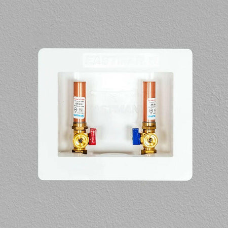 La caja de salida para lavadora con drenaje central PEX de expansión de 1/2 pulgada Eastman con supresores de martillo proporciona una instalación de suministro de agua segura para lavadoras. Es una caja de una sola pieza construida con plástico no corrosivo de alto impacto. Tiene un diseño empotrado que se adapta a paneles de yeso de 1 pulgada. Viene con un soporte preinstalado, una cubierta de placa frontal y válvulas de bola fría y caliente de 1/4 de vuelta para el cierre durante el mantenimiento. Las válvulas incluyen supresores de martillos que evitan que las tuberías vibren y golpeen. Esta caja de salida para lavadora tiene una conexión de entrada PEX de expansión de 1/2 pulgada y una salida de rosca de manguera macho de 3/4 pulgada. Está diseñado para aplicaciones residenciales. Aprobado por CUPC.
