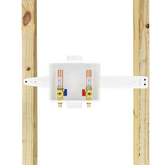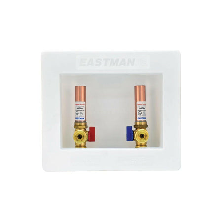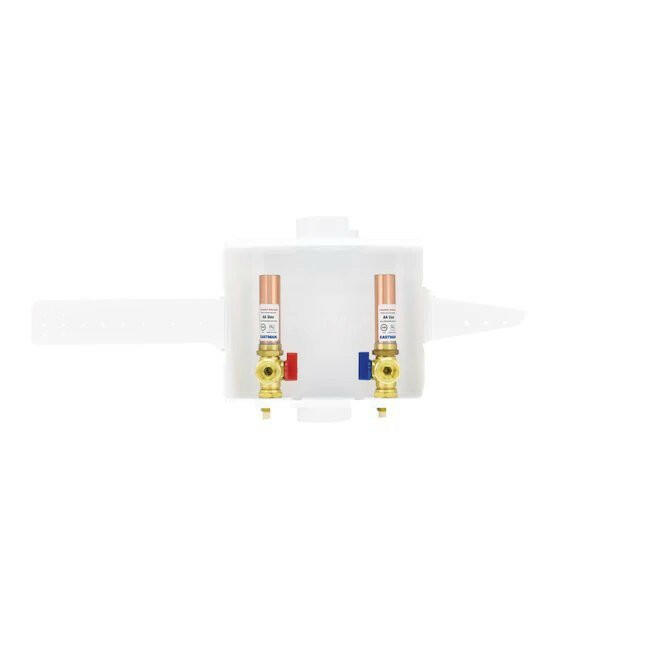 La caja de salida para lavadora con drenaje central Eastman® proporciona una instalación de suministro de agua segura para lavadoras. Es una caja de una sola pieza construida con plástico no corrosivo de alto impacto. Tiene un diseño empotrado que se adapta a paneles de yeso de 1 pulgada. Viene con un soporte de soporte preinstalado, una cubierta de placa frontal y válvulas de bola fría y caliente de 1/4 de vuelta para el cierre durante el mantenimiento; las válvulas incluyen supresores de martillos que evitan que las tuberías se sacudan y golpeen. Esta caja de salida para lavadora tiene una conexión de entrada de CPVC de 1/2 pulgada y una salida de rosca macho para manguera de 3/4 de pulgada. Está diseñado para aplicaciones residenciales. Aprobado por la UPC.
