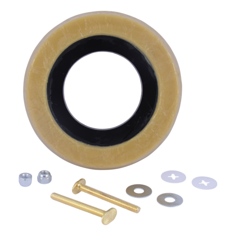 • Incluye: (1) anillo de cera reforzado con fieltro con brida de plástico, (2) pernos de latón de 1/4 pulg. x 2-1/4 pulg., (2) tuercas, (2) arandelas de seguridad de plástico y (2) arandelas.