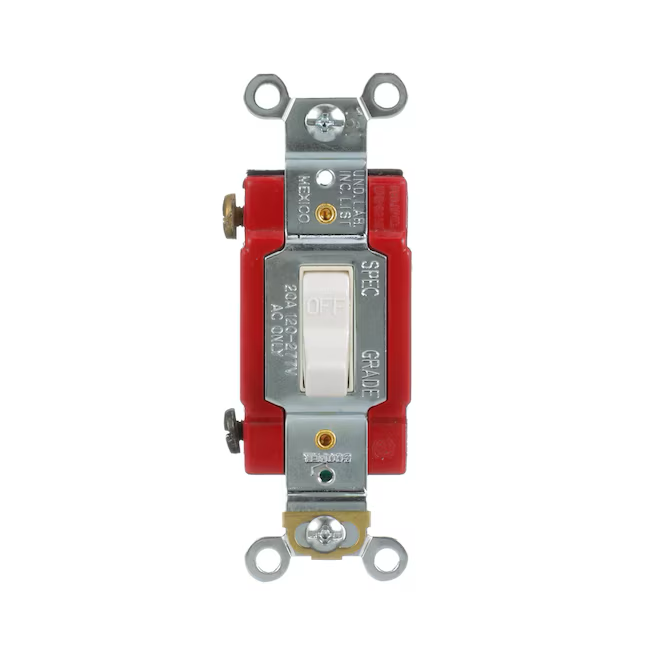 • El interruptor de palanca iluminado de grado industrial unipolar con acabado blanco ofrece una capacidad de 20 A, 120/277 V y presenta una ingeniería superior, confiabilidad, rendimiento y facilidad de instalación.
