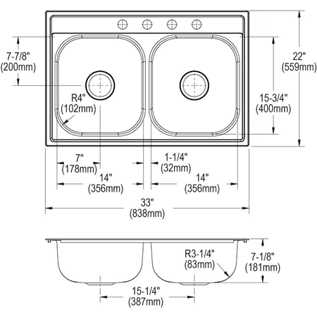 • Dimensions Diámetro de conexión de drenaje (pulgadas) 3.5 Altura del corte debajo del mostrador (pulgadas) 7 Longitud (Pulgadas) 33 Longitud de corte (pulgadas) 32.375 Tamaño mínimo del gabinete 36 pulgadas Ancho de corte (pulgadas) 21.375 Peso libras.) 8.5 Profundidad del tazón 1 (pulgadas) 7 Ancho (pulgadas) 22 Profundidad del tazón 2 (pulgadas) 7