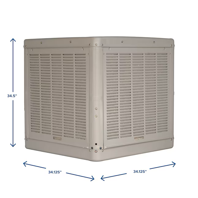 - Dimensions Profundidad (pulgadas) 34.13 Altura (pulgadas) 34,5 Capacidad de agua (galones) 8.6 Tamaño del motor N/A (se puede utilizar con varios motores) Peso (seco) (libras) 161 Grosor de la almohadilla (pulgadas) 0,13 Ancho (pulgadas) 34.13 Tamaño de la habitación (pies cuadrados) 1700