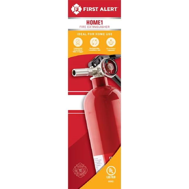 El extintor de incendios First Alert HOME1 puede ser su primera línea de defensa en caso de incendio en su hogar, barco, automóvil o negocio. El extintor doméstico multiusos es ideal para usar en cualquier lugar del hogar y está diseñado para combatir la madera; papel; tela; Incendios eléctricos y de líquidos inflamables. Este artículo cumple con los estándares de la Oficina de Autotransportes y UL y puede ser recargado por un profesional certificado. También incluye un soporte de montaje para mantener la unidad segura y al alcance. Si se produce un incendio dentro de la casa, esté preparado con el extintor de incendios doméstico estándar First Alert.