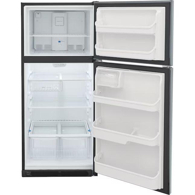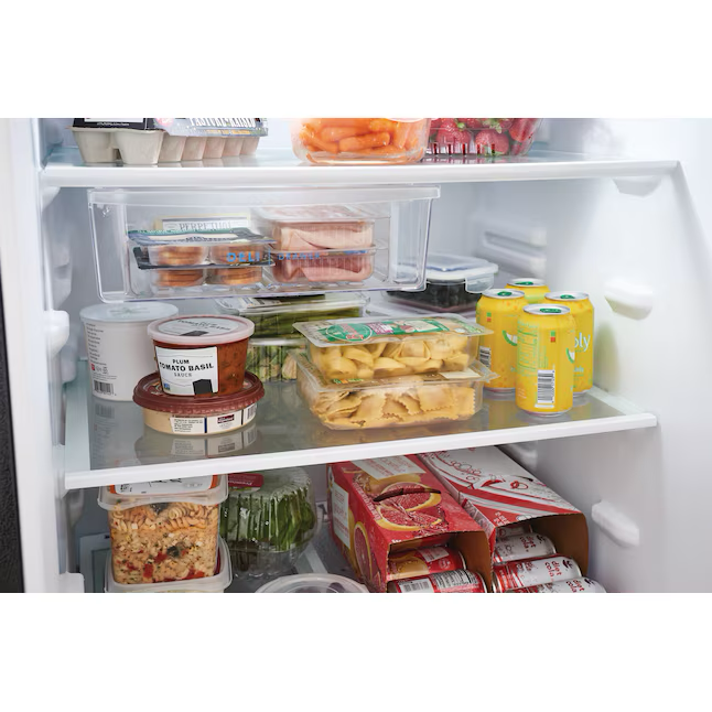 Con un refrigerador Frigidaire con congelador superior de 20,5 pies cúbicos, puede tener un refrigerador que se ajuste al mismo espacio que un refrigerador con congelador superior de 18 pies cúbicos, pero con más capacidad. Mantenga sus frutas y verduras frescas en nuestros cajones para verduras con control de humedad. El almacenamiento en la puerta para almacenar más galones le brinda espacio para artículos más grandes, como un galón de leche.