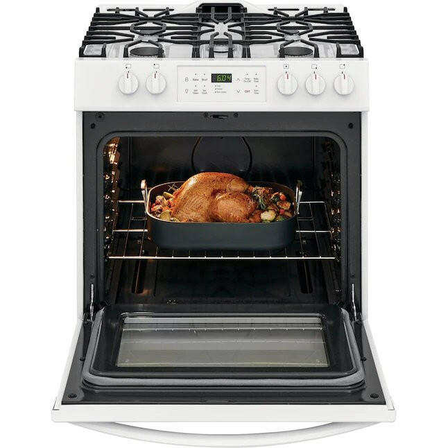La estufa de gas Frigidaire de 30 pulgadas ofrece la apariencia de una estufa empotrada, sin la remodelación. La poderosa estufa de cinco elementos está diseñada para manejar todas sus necesidades de cocción. Lleve las comidas a la mesa más rápido con el hervor rápido, coloque ollas y sartenes grandes con el elemento extra grande y mantenga la comida caliente hasta que todos estén listos para comer con la zona para mantener caliente. La limpieza es muy sencilla con ciclos de autolimpieza de 2 y 3 horas.