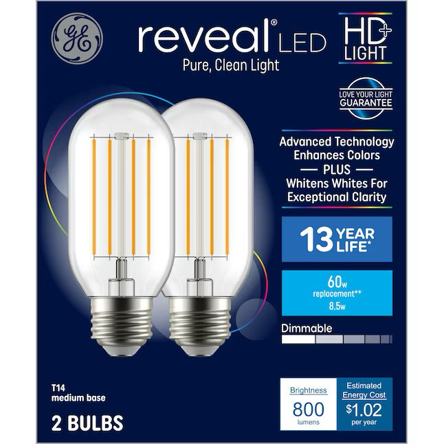 GE Reveal HD Bombilla LED regulable de base media (e-26) EQ T14 de 60 vatios (paquete de 2)