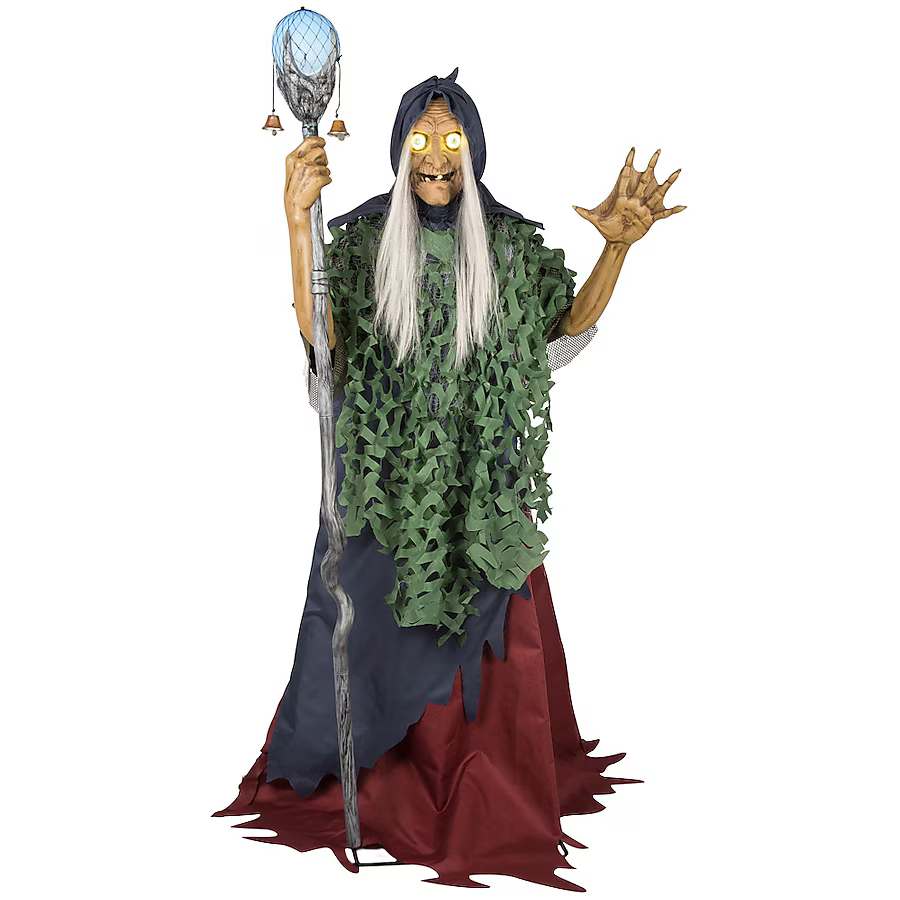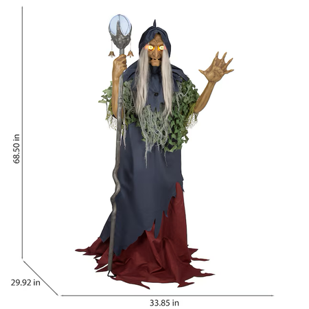 DECORACIÓN ANIMADA DE HALLOWEEN: Bruja animada de interior de 5,5 pies de alto x 3,3 pies de ancho x 2,6 pies de profundidad con sonido y efectos de luz LED con ropa hecha jirones de algas y bastón iluminado