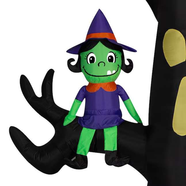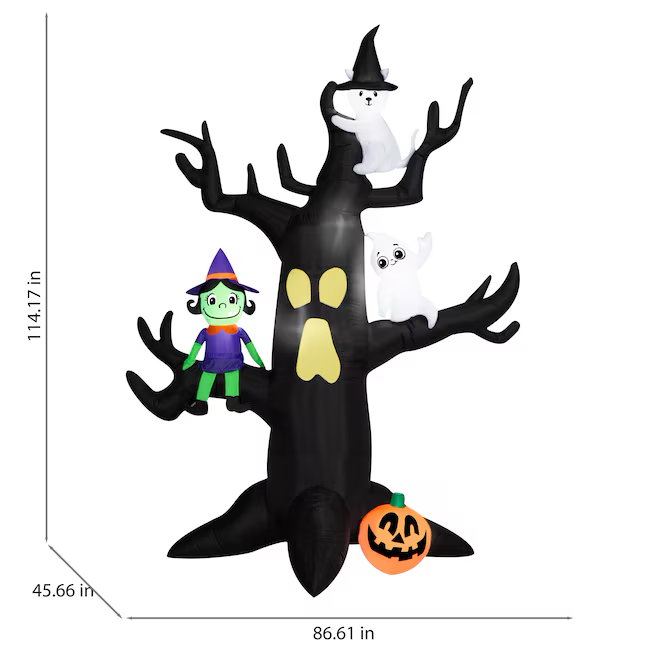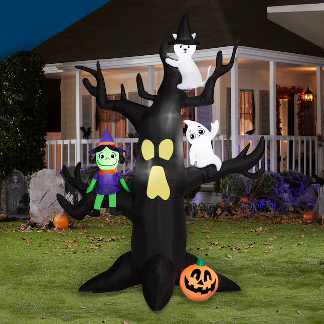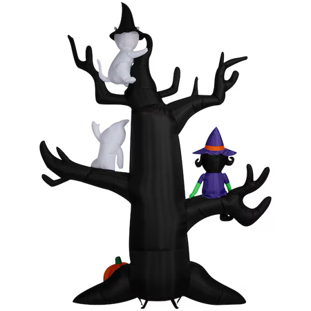 INFLABLE DE HALLOWEEN: Árbol embrujado inflable Airblown® de 9,6 pies de alto x 7,3 pies de ancho x 4 pies de profundidad con ramas espeluznantes y una linda bruja, fantasma, gato y calabaza