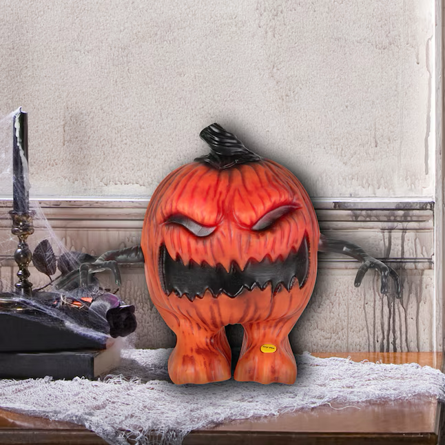 • DECORACIÓN ANIMADA DE HALLOWEEN: criatura de calabaza podrida para interiores que ríe y camina, de 9,5 pulgadas de alto x 11 pulgadas de ancho x 5,5 pulgadas de profundidad, con movimiento realista y luz LED.