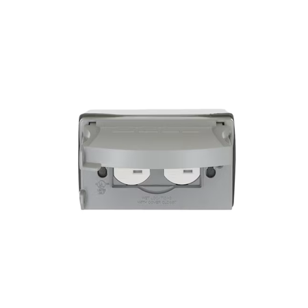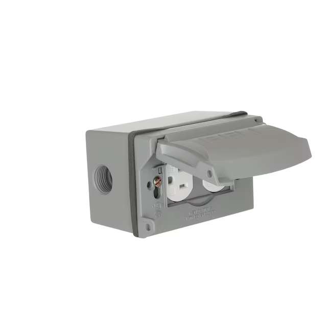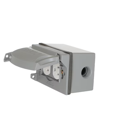 Incluye tapa abatible, receptáculo dúplex WR/TR de 15 A y una caja de salida con tres salidas roscadas de 1/2 pulg.