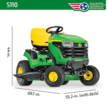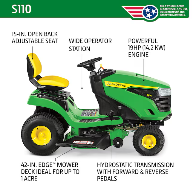 El tractor cortacésped John Deere S110 es el modelo intermedio de la Serie 100, con plataforma de 42 pulgadas. Su manejo es cómodo. El S110 cuenta con transmisión hidrostática, pedales contiguos, un diseño mejorado, controles ajustables y un asiento trasero abierto de 15 pulgadas. El sistema de corte Edge™ de 42 pulgadas ha demostrado su eficacia y ofrece una calidad de corte superior, además de permitir el ensacado o el triturado. El motor monocilíndrico de la marca John Deere tiene 19 HP: potencia suficiente para hasta una hectárea.