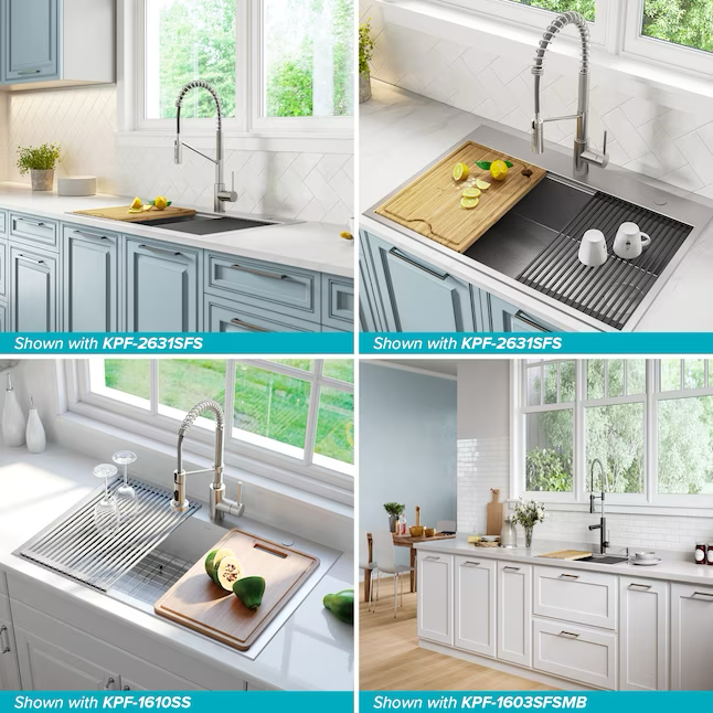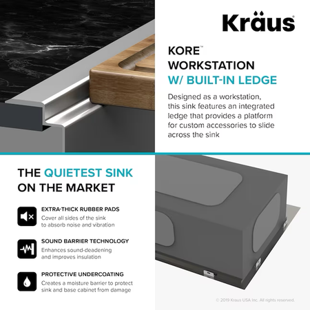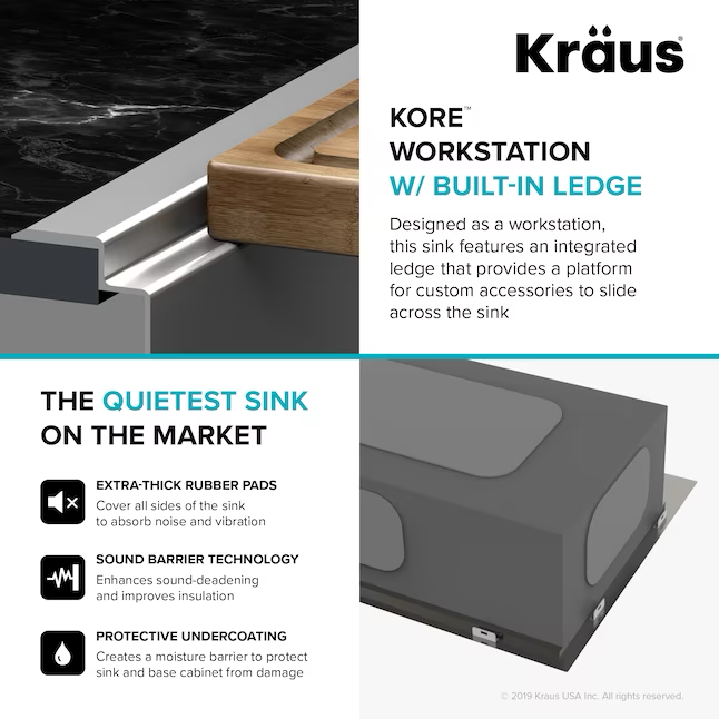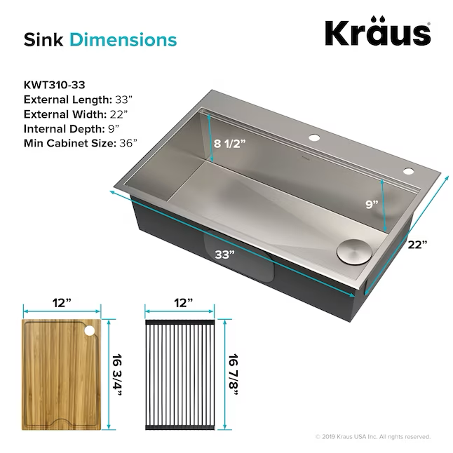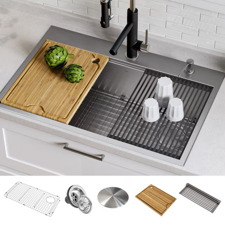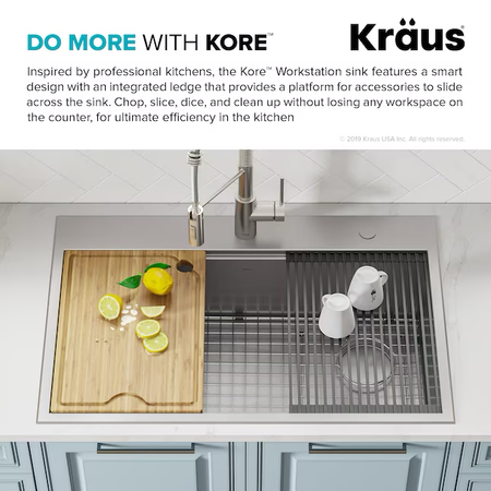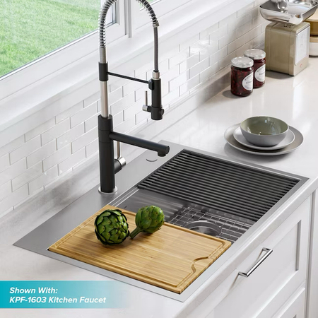 Kraus Kore Workstation Fregadero de cocina con estación de trabajo de 2 orificios y un solo tazón de acero inoxidable de montaje doble, 33 x 22 pulgadas