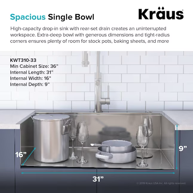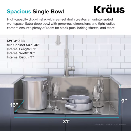 • Dimensions Diámetro de conexión de drenaje (pulgadas) 3.5 Altura del corte debajo del mostrador (pulgadas) 9.0 Longitud (Pulgadas) 33 Longitud de corte (pulgadas) 31.0 Tamaño mínimo del gabinete 36 pulgadas Ancho de corte (pulgadas) 20.0 Peso libras.) 30.03 Profundidad del tazón 1 (pulgadas) 9.0 Ancho (pulgadas) 22
