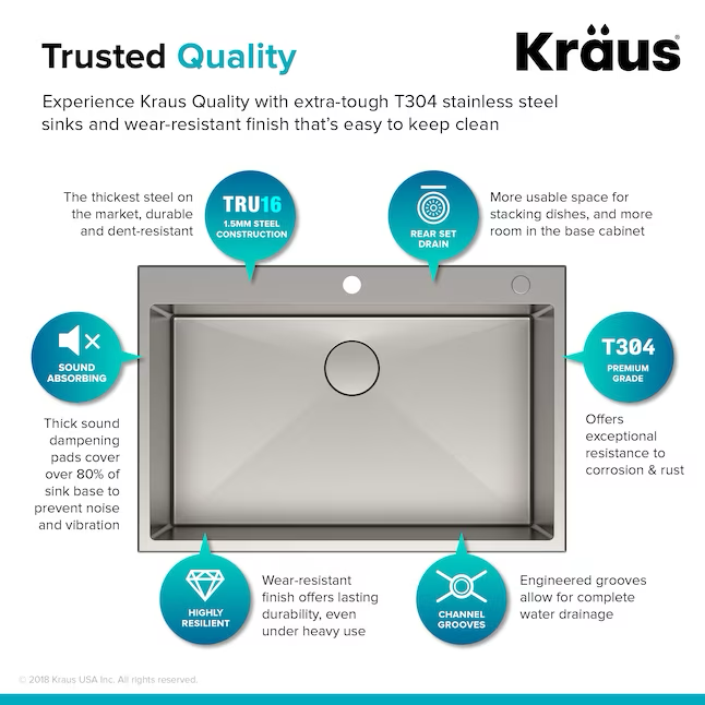 • Fregadero duradero y resistente a abolladuras fabricado con acero inoxidable T304 de calibre 16 real TRU16 de primera calidad.