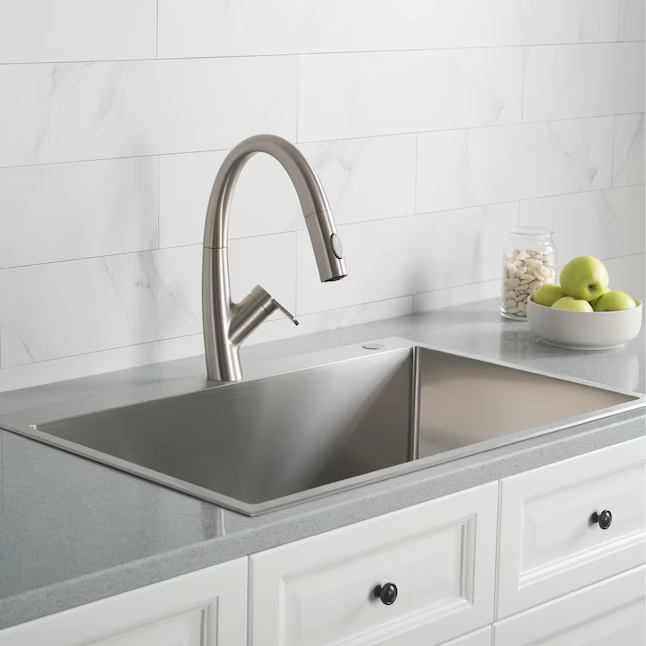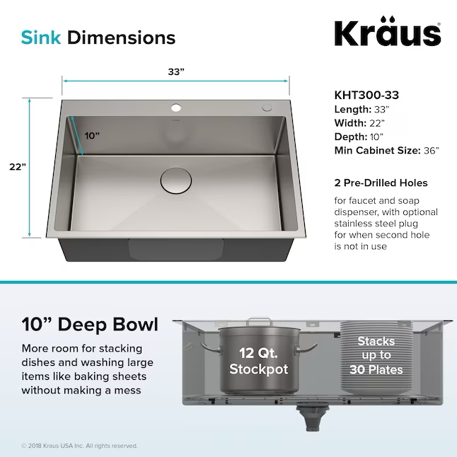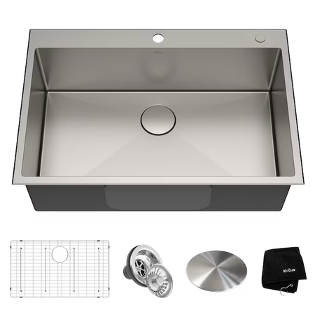 Kraus Standart PRO Fregadero de cocina de 2 orificios de un solo tazón de acero inoxidable de 33 x 22 pulgadas de montaje doble