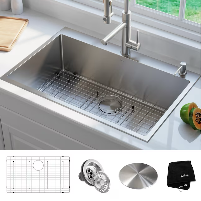 • EL JUEGO DE COCINA INCLUYE: Fregadero, rejilla inferior, conjunto de drenaje, tapa de drenaje extraíble, paño de cocina Kraus, accesorios de montaje, plantilla recortada